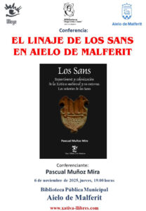 Aquest dijous 6 de novembre, a les 19 hores, la Biblioteca Pública Municipal d’Aielo de Malferit acollirà la conferència «El llinatge dels Sans d’Aielo de Malferit», a càrrec de l’historiador i investigador Pascual Muñoz Mira. L’acte s’inscriu en el marc del cicle cultural de la biblioteca i inclourà també la presentació de la seua obra Los Sans. Repartiment y colonización de la Xàtiva medieval y su entorno. Los señoríos de los Sans.