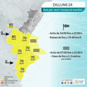 Recomanem màxima prudència en zones arbolades, parcs, façanes i terrasses, així com en desplaçaments per carretera. Aquest tipus d’episodis poden provocar caiguda de branques, despreniments de mobiliari urbà o incidències en elements poc assegurats, per la qual cosa es recorda la necessitat de revisar objectes susceptibles de ser arrossegats pel vent.