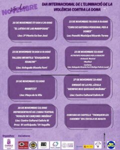 El 23 de novembre, l’Avinguda Vicente Ferri acollirà dues activitats de caràcter comunitari. Per al públic infantil hi haurà tallers sota el nom “Eduquem en igualtat”. A continuació, l’associació feminista local Peroleres per la Igualtat ha preparat una actuació musical, acompanyada de la lectura del manifest i intervencions públiques.