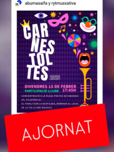 La Falla Abú Masaifa ha comunicat l’ajornament de l’activitat de Carnestoltes prevista per a aquest divendres a causa de la previsió d’alerta climatològica. En el missatge difós a les seues xarxes socials, l’entitat assenyala que “davant la previsió d’alerta climatològica… s’ajorna l’activitat”.