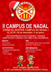 A més del torneig escolar, el Club Handbol Xàtiva posarà en marxa el seu Campus de Nadal, que començarà el 23 de desembre i s’estendrà durant diversos dies del període festiu.