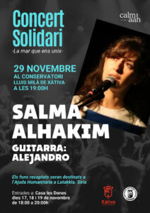 El Conservatori Lluís Milà de Xàtiva acollirà el pròxim dissabte 29 de novembre a les 19.00 hores el concert solidari “La mar que ens unix”, una iniciativa impulsada per l’Associació Calmaah amb l’objectiu de recaudar fons per a enviar ajuda humanitària a Síria, concretament a la regió de Latakia, on centenars de persones continuen patint les conseqüències de la guerra, la fam i la pobresa.