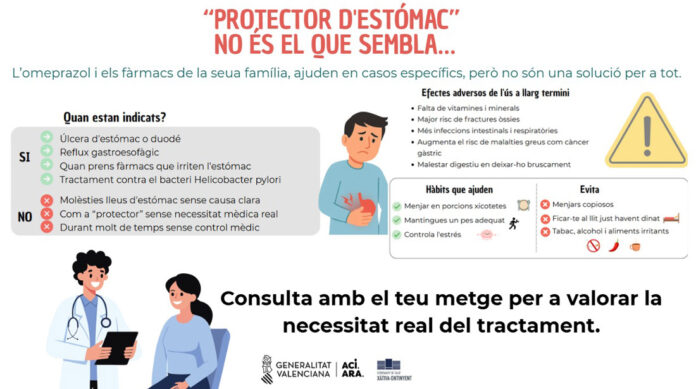 Els IBP redueixen la quantitat d’àcid produït per l’estómac i s’utilitzen habitualment per a tractar acidesa, reflux o úlceres. Tot i això, la campanya recorda que un ús prolongat o sense indicació mèdica pot comportar efectes adversos i confusions sobre el seu paper terapèutic. De fet, s’ha detectat que molts pacients prenen omeprazol i altres fàrmacs similars de forma diària i durant períodes massa llargs. La iniciativa recalca que «estos medicaments no són protectors de l’estómac, sinó tractaments per a situacions específiques».