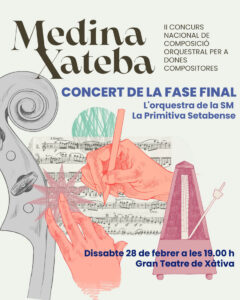 El Gran Teatre de Xàtiva serà l’escenari del concert de la fase final del II Concurs Nacional de Composició Orquestral per a Dones Compositores “Medina Xateba”, una cita en la qual participarà l’orquestra de la Societat Musical La Primitiva Setabense. La segona edició del certamen arriba després que l’entitat convocara el concurs el passat mes de novembre.