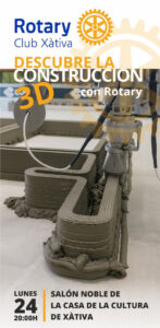 El Rotary Club de Xàtiva ha impulsat la formació especialitzada en construcció 3D amb la primera fase del seu programa de beques internacionals, una iniciativa que busca reforçar les oportunitats de futur dels joves i contribuir al progrés de la comunitat. Aquesta fase inicial, ajornada recentment per causes d’alerta meteorològica, es presenta finalment hui a la Casa de la Cultura de Xàtiva a les 20 hores dins del projecte «Descobreix la construcció 3D amb Rotary».