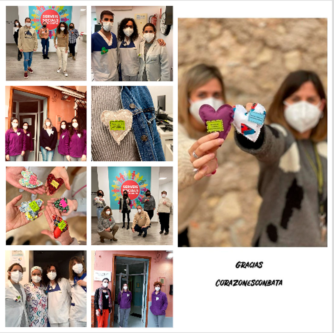 Entre els missatges que es poden llegir a aquests cors de tela es troben alguns com ara «gràcies, sou essencials», «ànim, junts ho aconseguirem», o «gràcies per cuidar de nosaltres».