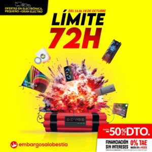 Del 16 al 18 d’octubre, Embargosalobestia activa “Límit 72h”, una campanya llampec amb preus irresistibles en Gran electrodomèstic, Petit electrodomèstic i Electrònica. Tres dies de bogeria per a renovar la llar amb les millors marques i descomptes de fins al -50%.