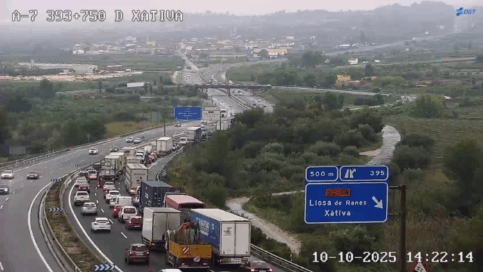 A Xàtiva, un accident al punt quilomètric 394 de la A-7, en sentit Alacant, ha obligat a tallar el carril esquerre de la via i ha generat més de quatre quilòmetres de cues. Segons fonts de Trànsit, l’incident hauria estat causat per l’asfalt lliscant després d’hores de pluja continuada, que ha complicat la circulació de camions i vehicles pesants al llarg del matí.