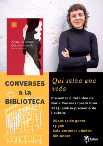 La Biblioteca Municipal de Xàtiva acollirà aquest dijous 15 de gener, a les 19:30 hores, la presentació literària de la novel·la «Qui salva una vida», dins del cicle Converses a la Biblioteca. La sessió tindrà lloc a la Sala de persones adultes i comptarà amb la presència de l’autora.