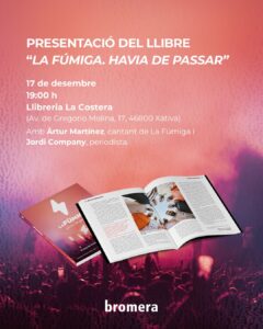 La Llibreria La Costera de Xàtiva acollirà el pròxim 17 de desembre, a les 19.00 hores, la presentació i signatura del llibre La Fúmiga, havia de passar, una obra que repassa la trajectòria d’un dels grups més destacats del panorama musical valencià recent.