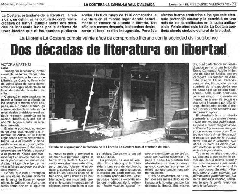 Els seus inicis no van estar exempts de dificultats. Instal·lada inicialment al carrer Pere IV d’Aragó, la llibreria va patir el 25 de novembre de 1976 un atemptat amb bomba atribuït a l’extrema dreta, que va provocar importants danys materials. Malgrat això, els seus fundadors van decidir continuar endavant. “Aquell episodi explica molt bé què ha sigut sempre La Costera: un espai que no ha renunciat mai a la cultura ni a la llibertat”, ha recordat el seu actual propietari, Josep Gregori.