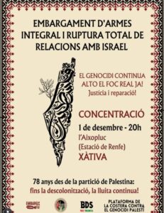 Davant aquest escenari, plataformes solidàries de la comarca han convocat la ciutadania a una concentració de protesta hui 1 de desembre a les 20 h a l’Aixopluc, a la plaça de l’estació de Xàtiva. L’objectiu és visibilitzar la situació a Gaza i exigir el respecte als drets humans i l’entrada immediata d’ajuda humanitària.