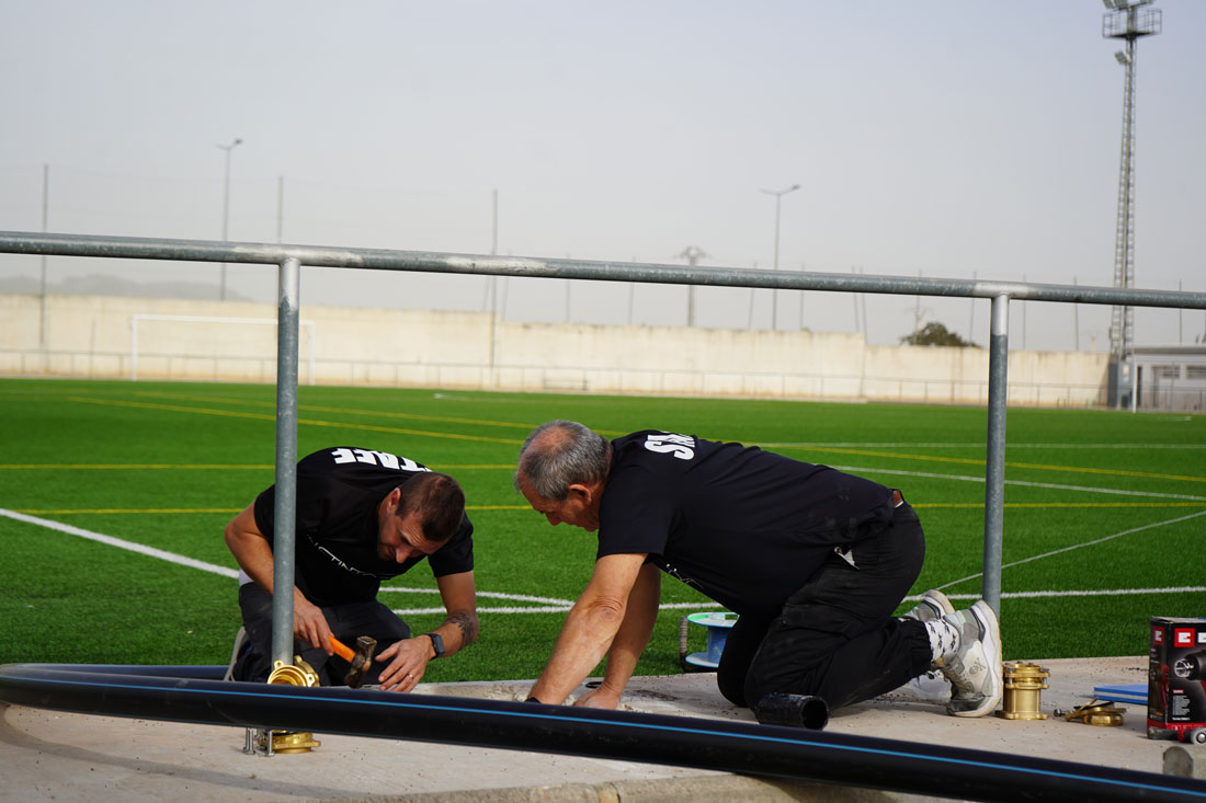 Pel que fa al camp de futbol 11 del Paquito Coloma, aquesta setmana s’està renovant la canonada general del sistema de reg, ubicada a la zona posterior de la porteria pròxima a l’entrada del pàrquing. L’antiga conducció presentava fuites recurrents, motiu pel qual s’ha optat per la seua substitució. Les tasques han inclòs la localització de la xarxa existent i l’obertura de rases per a una nova instal·lació que passarà a situar-se fora del terreny de joc, fet que facilitarà el manteniment i reduirà possibles problemes futurs.