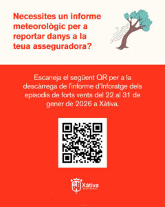 L’Ajuntament de Xàtiva ha difós un codi QR per a descarregar un informe meteorològic que acredita els episodis de forts vents registrats a la ciutat entre el 22 i el 31 de gener. El document està pensat per a les persones que necessiten aportar justificació tècnica en la tramitació de danys davant la seua asseguradora.