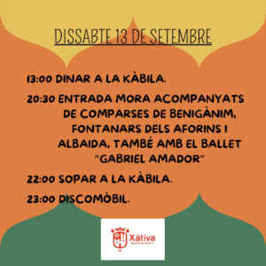Aquest dissabte començarà amb un dinar de germanor a la Kàbila, que donarà pas a l’acte central de la programació: l’entrada mora pels carrers del barri, acompanyada de comparses convidades d’altres municipis i del ballet Gabriel Amador, que aportarà la seua nota artística i de color a la desfilada. La nit continuarà amb un sopar a la Kàbila i es tancarà amb una discomòbil oberta a tot el públic, que reunirà nombroses persones.