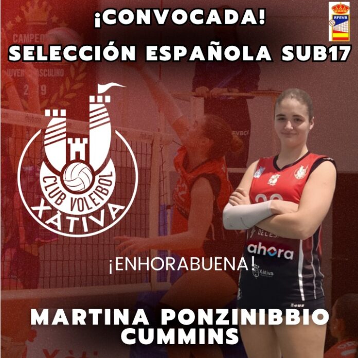 Martina Ponzinibbio Cummins, integrant del Club Voleibol Xàtiva, ha sigut convocada per la selecció espanyola sub17 per a disputar el Torneig de la Confederació Europea WEVZA que tindrà lloc a Barcelos (Portugal) del 22 al 27 de juliol de 2025. La concentració prèvia serà del 4 al 21 de juliol a Azuqueca de Henares (Guadalajara).