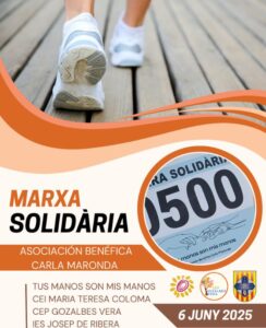 Aquest divendres 6 de juny, Xàtiva es vesteix de solidaritat amb la celebració d’una marxa solidària organitzada per l’Associació Benèfica Carla Maronda i amb la participació activa del CEI Maria Teresa Coloma, el CEP Gozalbes Vera i l’IES Josep de Ribera. L’esdeveniment té com a objectiu recaptar fons per a l’associació Tus Manos Son Mis Manos.
