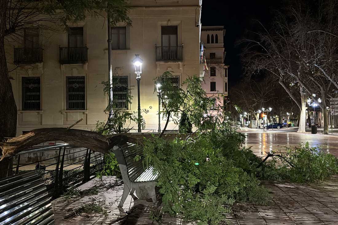 Pocs minuts després, a les 22.20 hores, la Policia Nacional va comunicar la caiguda d’una branca de grans dimensions sobre la vorera al carrer Cosmògraf Ramírez. La zona va quedar senyalitzada i es va avisar el servei de Jardineria per a la retirada.