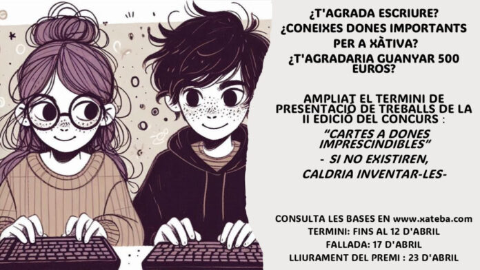 Xateba ha ampliat fins al 12 d’abril el termini de presentació de treballs de la II edició del concurs «Cartes a dones imprescindibles», una iniciativa vinculada al 8 de Març que convida el jovent a escriure sobre dones rellevants per a Xàtiva. Segons figura en el cartell difós per l’entitat, la fallada del jurat es farà pública el 17 d’abril i el lliurament del premi tindrà lloc el dia 23.