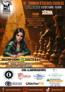 El Club d’Escacs La Primitiva de Xàtiva ha organitzat el XI Torneig d’Escacs Escolars, que tindrà lloc aquest diumenge 5 d’octubre a partir de les 10.00 h al Pavelló Municipal de Voleibol de la ciutat. La competició reunirà joves esportistes de tota la comarca i d’altres localitats en una jornada que combina esport, formació i convivència.
