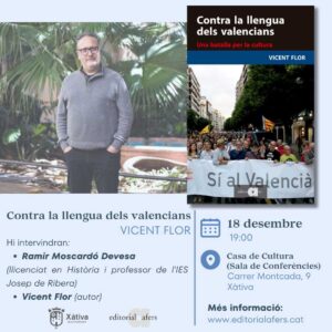 La Casa de Cultura de Xàtiva acollirà aquest dijous 18 de desembre, a les 19.00 hores, la presentació del llibre Contra la llengua dels valencians, una obra de Vicent Flor que analitza els atacs i conflictes al voltant de la llengua pròpia dels valencians en el context social, cultural i polític contemporani.