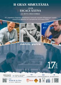 Daniil Yuffa, nascut a Rússia i nacionalitzat espanyol en 2021, és reconegut tant pel seu talent en els taulers com per la seua ètica i compromís social, sent un dels signants de la carta pública contra la guerra d’Ucraïna. La seua presència a Xàtiva suposa una ocasió excepcional per veure en acció a un autèntic artista dels escacs, conegut per les seues exhibicions tocant el piano mentre juga partides a cegues o memoritzant combinacions impossibles en els taulers.